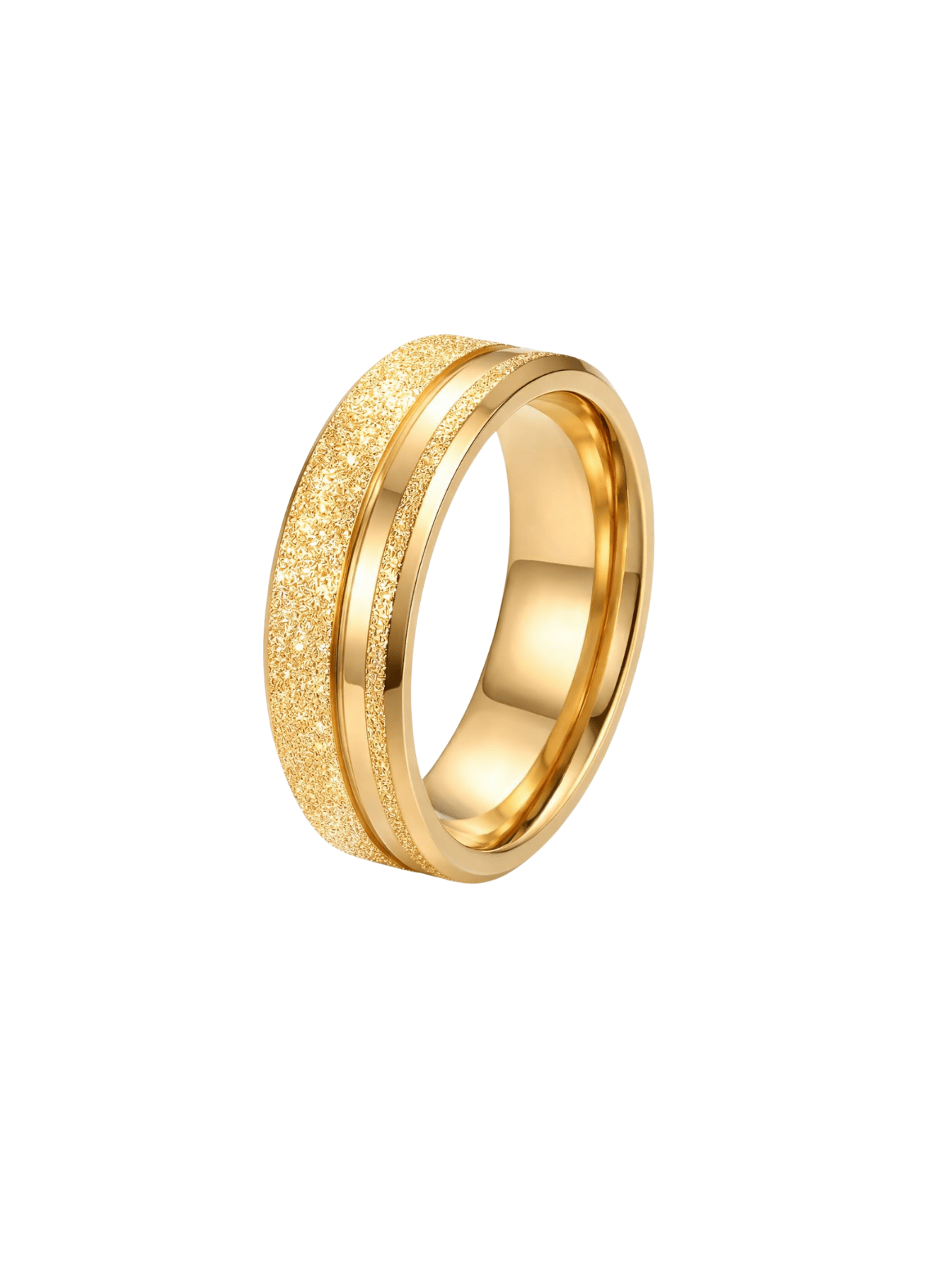Centro Jateado (Sand-Blasted finish): Uma faixa central com acabamento texturizado e brilhante, que captura e reflete a luz de forma sutil e sofisticada, criando um efeito visual "glitter" elegante.