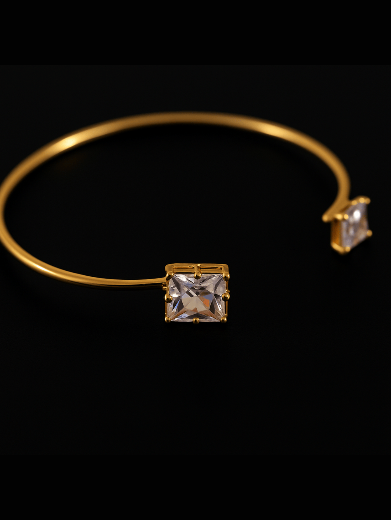 Realce sua beleza com este bracelete sofisticado, perfeito para quem ama elegância com um toque de brilho. Com design delicado e moderno, a peça é folheada a ouro e verniz e conta com duas pedras de zircônia lapidadas em formato quadrado, que refletem a luz de forma deslumbrante.