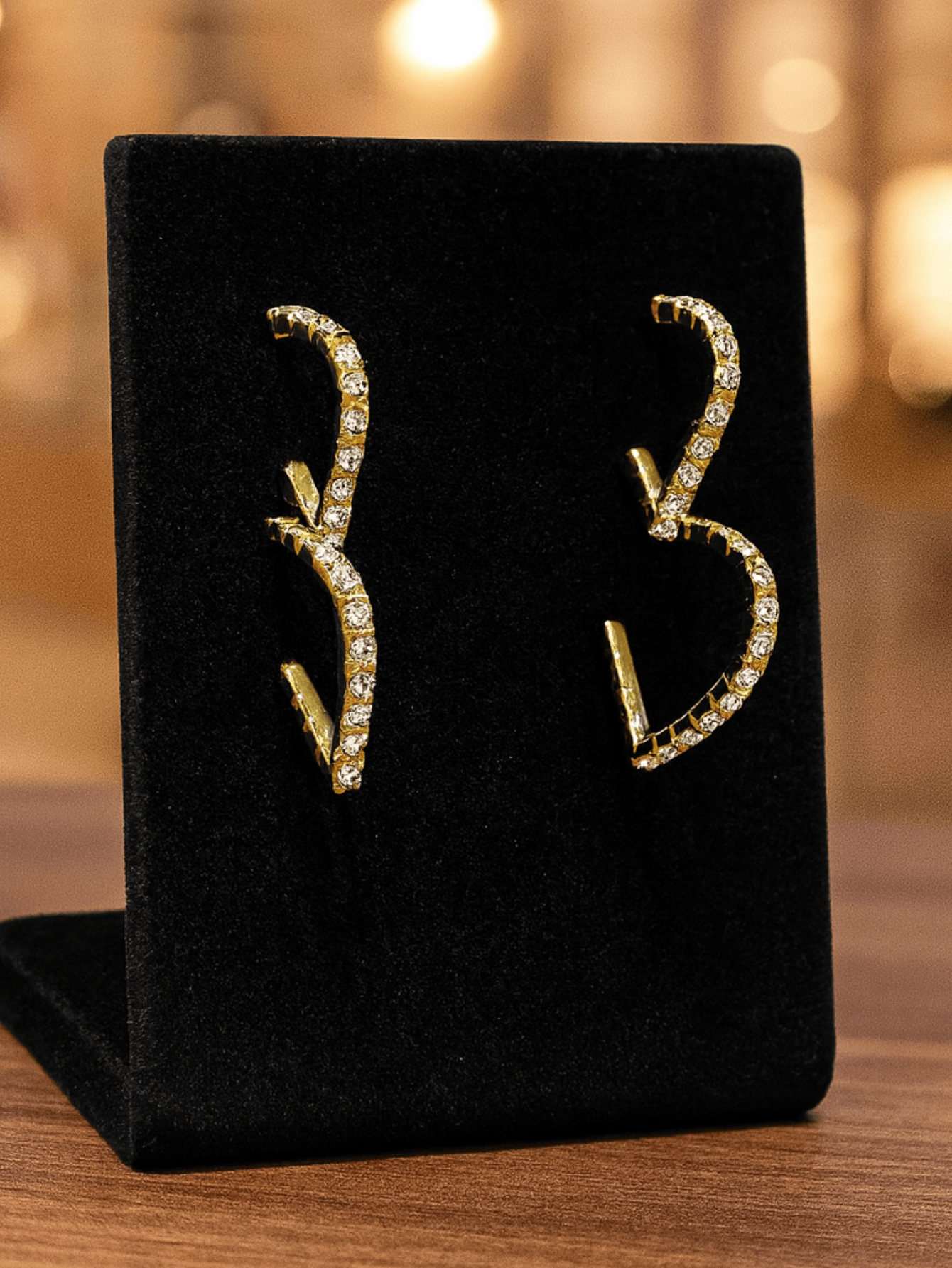 💎 Brilho Intenso: Cada brinco é ricamente cravejado com microzircônias de alto brilho que capturam a luz de forma espetacular. O detalhe cravejado na parte reta e na curva adiciona uma textura rica e um glamour inegável.