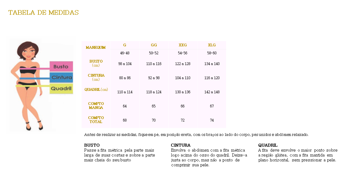 TAM G ou G1: equivale ao 46/48 e tem 98-104cm de busto, 80-86cm de cintura e 110-114cm de quadril, com 64cm de comprimento na manga e 68cm de comprimento total.
