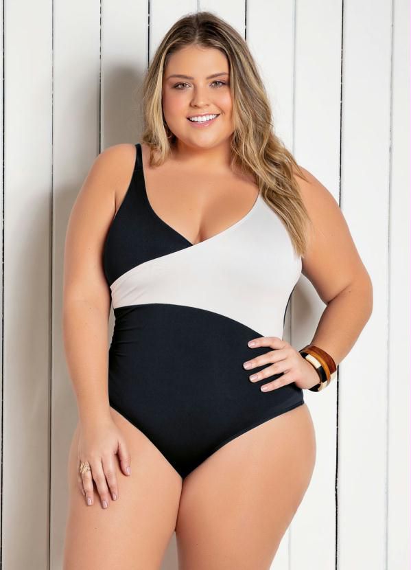 Modelo bicolor em preto e braco, com decote transpassado formando decote em V.