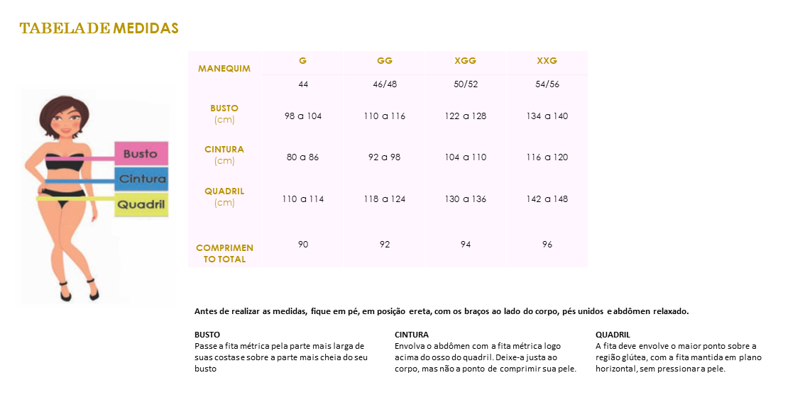 TAM XGG ou G3: equivale ao 50/52 e tem 122-128cm de busto, 104-110cm de cintura e 130-136cm de quadril com 94cm de comprimento.